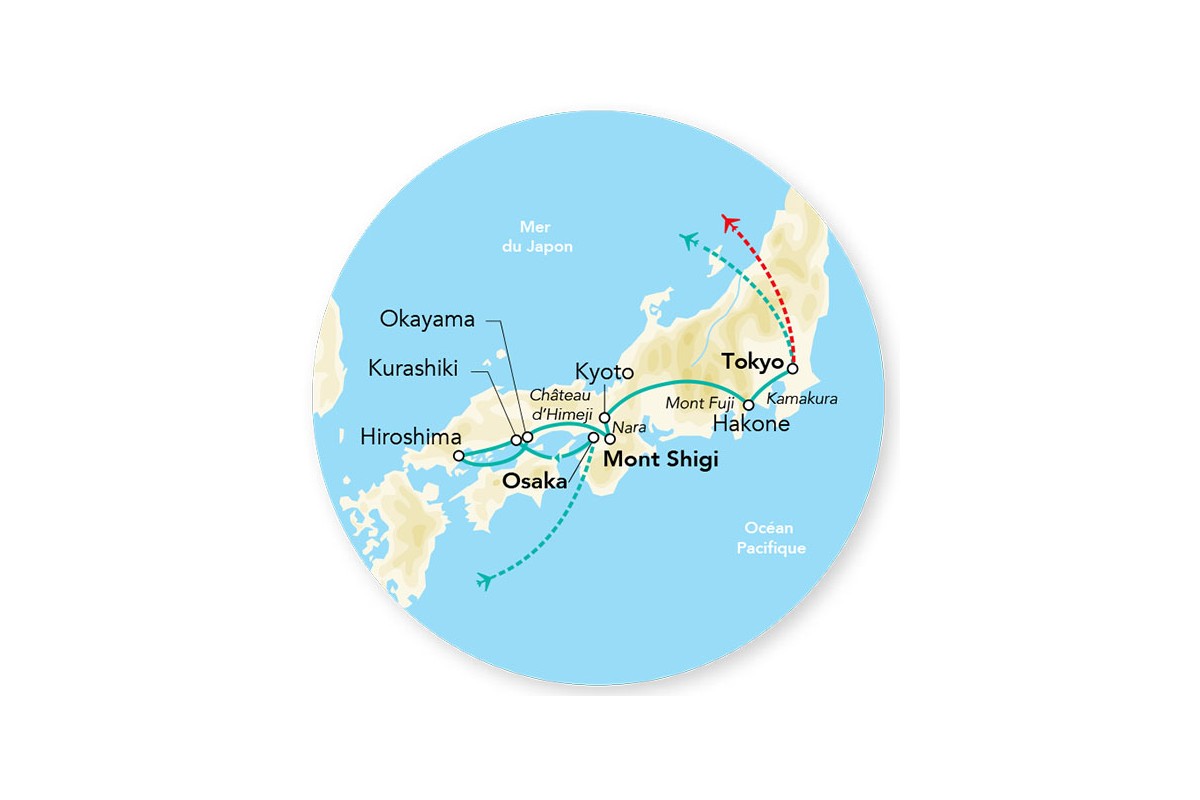 Traversée en ferry vers l’île sacrée de Miyajima, considérée comme l’un des plus beaux paysages de l’archipel. Visite du sanctuaire rouge vermillon d’Itsukushima, dédié à la déesse gardienne des mers et en partie construit dans la mer – à marée haute, avec le torii, il semble flotter. Promenade dans la rue commerçante Omotesando. Déjeuner d’okonomiyaki (la « crêpe japonaise »), spécialité d’Hiroshima. Continuation sur Okayama : promenade dans le jardin Korakuen, considéré comme l’un des plus beaux du pays, avec pour toile de fond le château d’Okayama. Ce chef-d’œuvre créé en 1687 se compose d’immenses pelouses, d’étangs reliés par des canaux, d’une superbe forêt d’érables et de plusieurs pavillons de thé. (P.déj – Déj – Dîn)